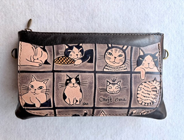 前の柄部分は ポケットになっています 裏側にファスナーポケット15センチ お札 銀行通帳 小物入れなど色々な使い方が出来ます。 サイズ 横19.5センチ 縦11センチ マチ無し Dカン両サイド付きショルダー紐など付けて頂くことが出来ます 牛革 裏地 合皮使用