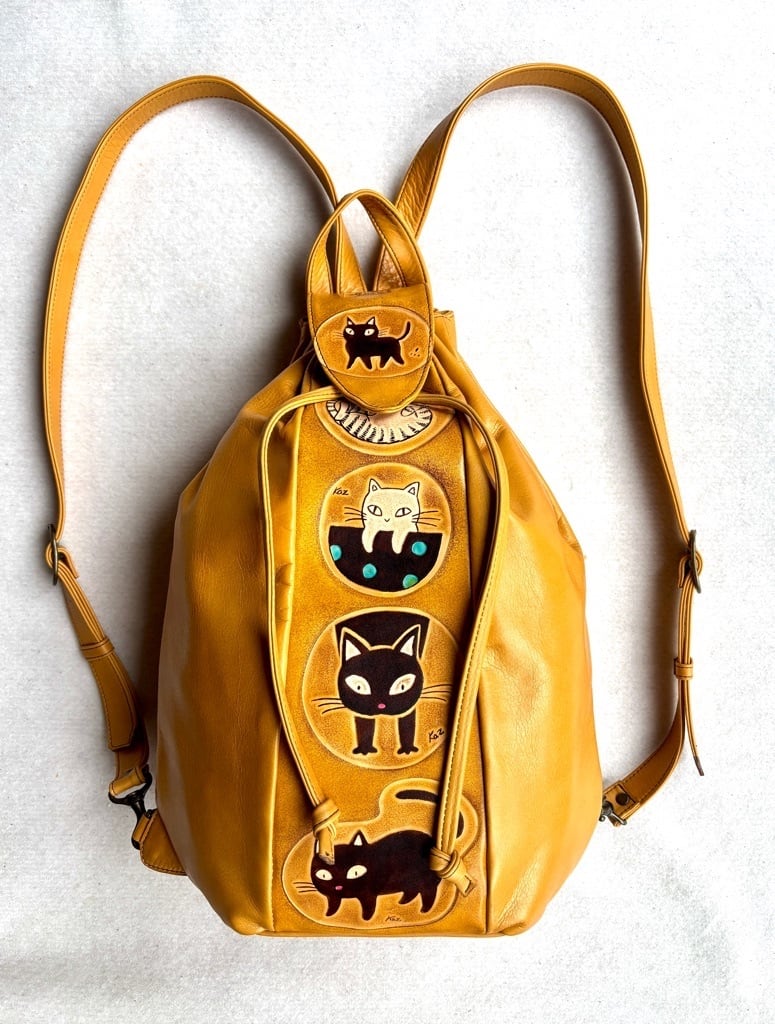 ソフトな牛革使用 口元はキンチャクで開閉出来ますが 背側からもファスナー開閉で中を出し入れできます 中にはファスナーポケットと携帯が入るポケット有ります 柄は前蓋と前側 背側に入ってます 柄部分は染料で染色してあります