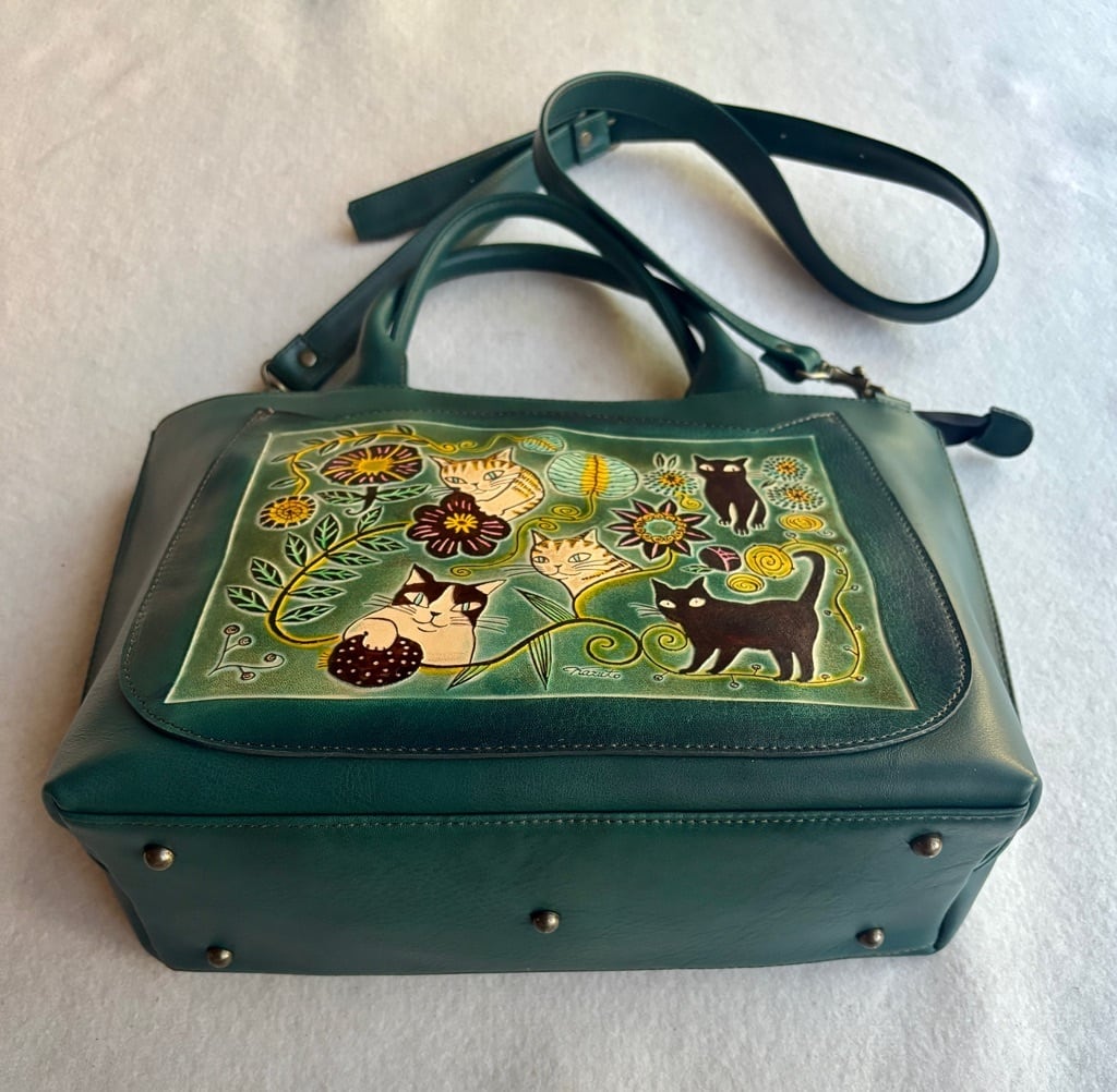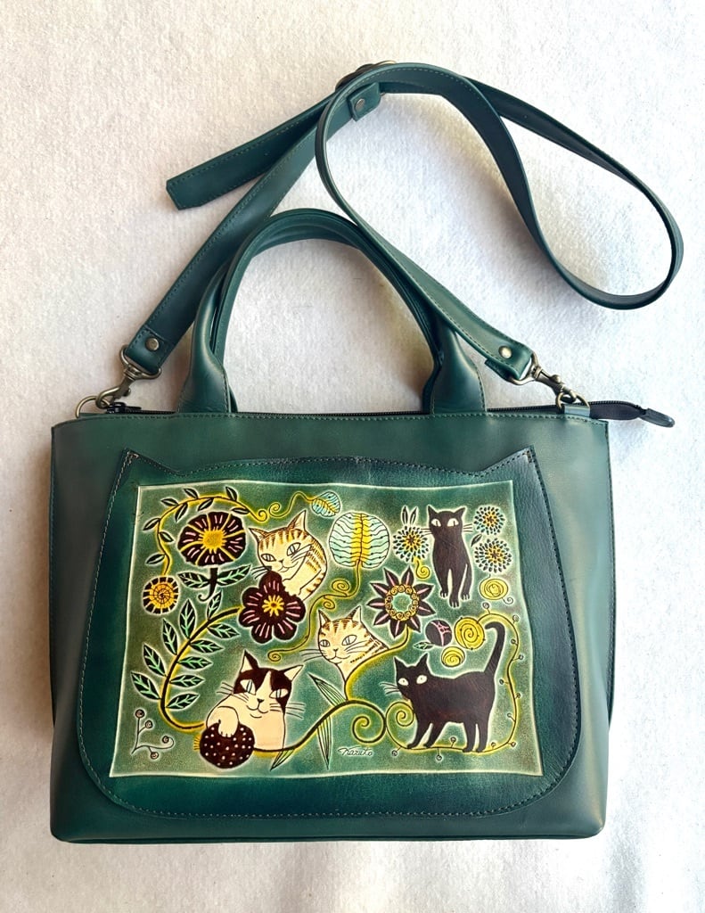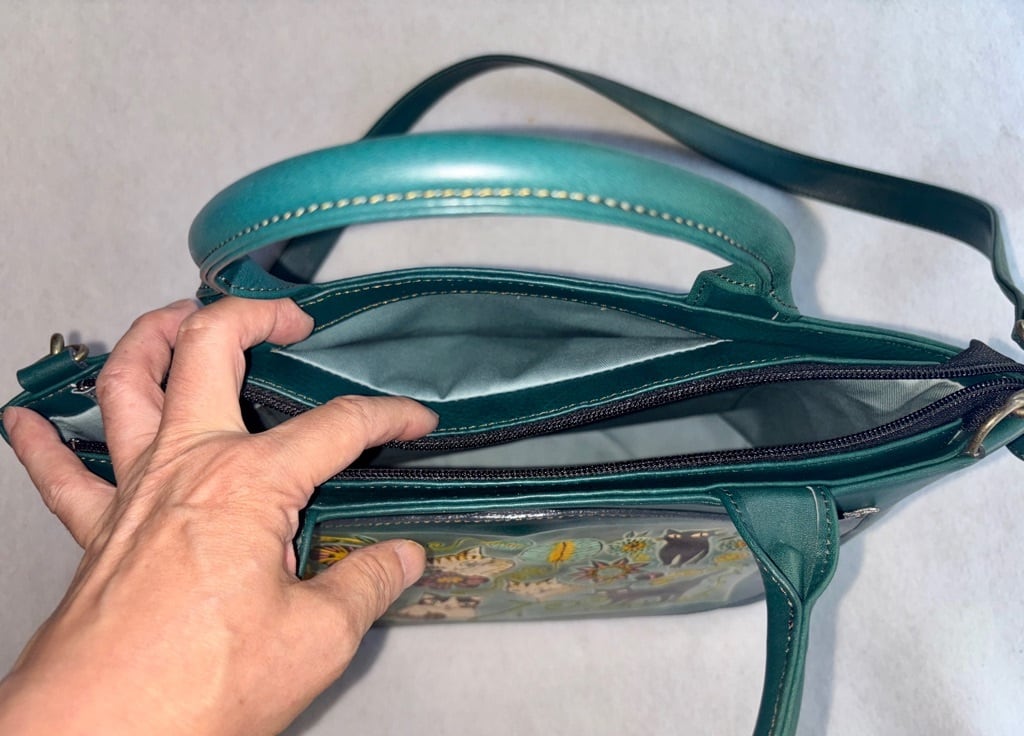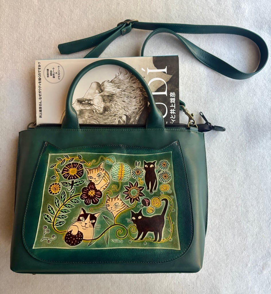 本体ソフトで細かいシボの牛革使用 本体ファスナー開閉 エンドがネコシルエットになつています