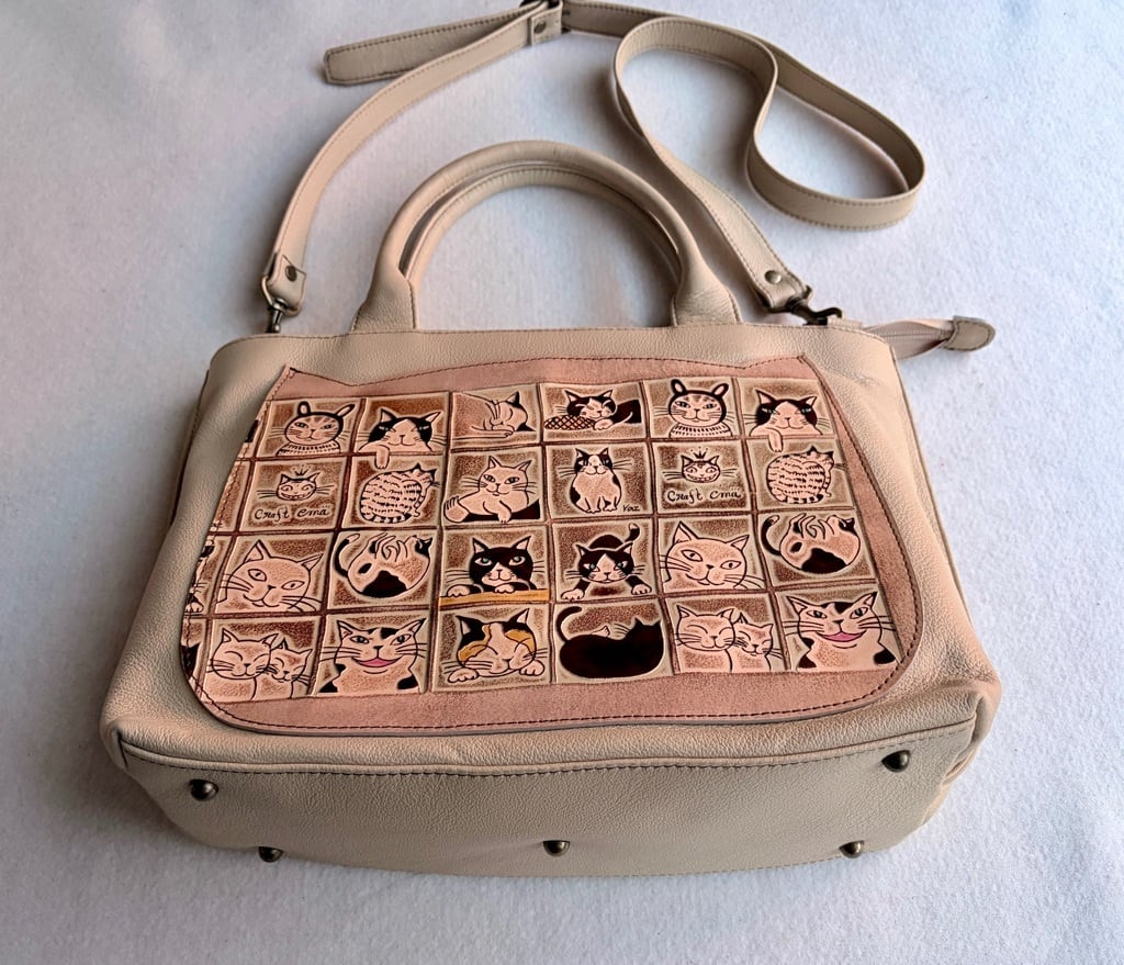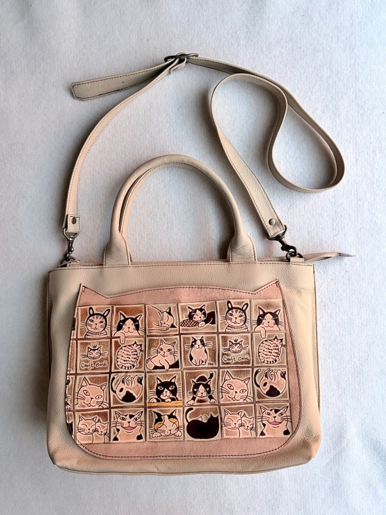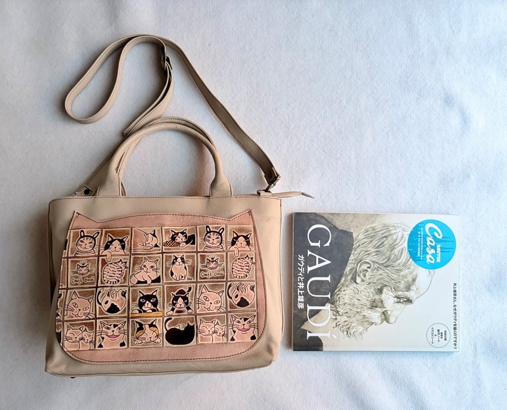 本体ソフトで細かいシボの牛革使用 本体ファスナー開閉 エンドがネコシルエットになつています